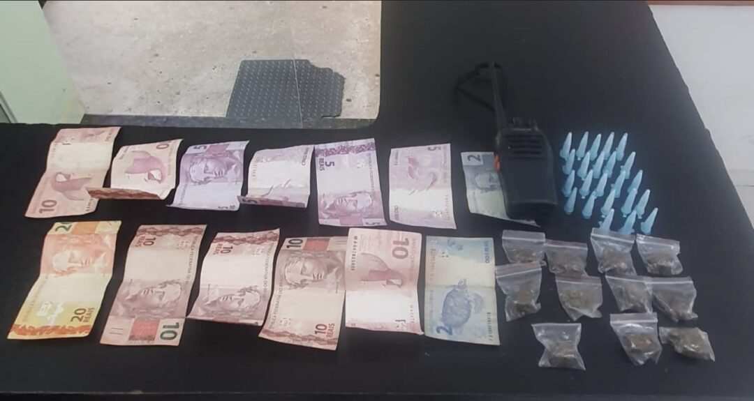 Durante a varredura no trajeto percorrido, a equipe localizou porções de entorpecentes, dinheiro em espécie e um rádio comunicador. Diante dos fatos, foi dada voz de prisão em flagrante.