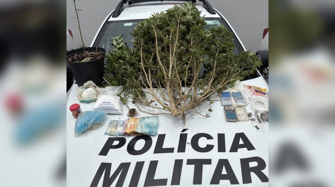 Ao todo, foram apreendidos R$ 1.238,00 em dinheiro, 13 papelotes de maconha (46,92 gramas), três pés de maconha (2.562 gramas), um pacote de pasta base de cocaína (125,98 gramas), um pacote de substância branca não identificada (1.123 gramas) e diversos apetrechos para embalo.
