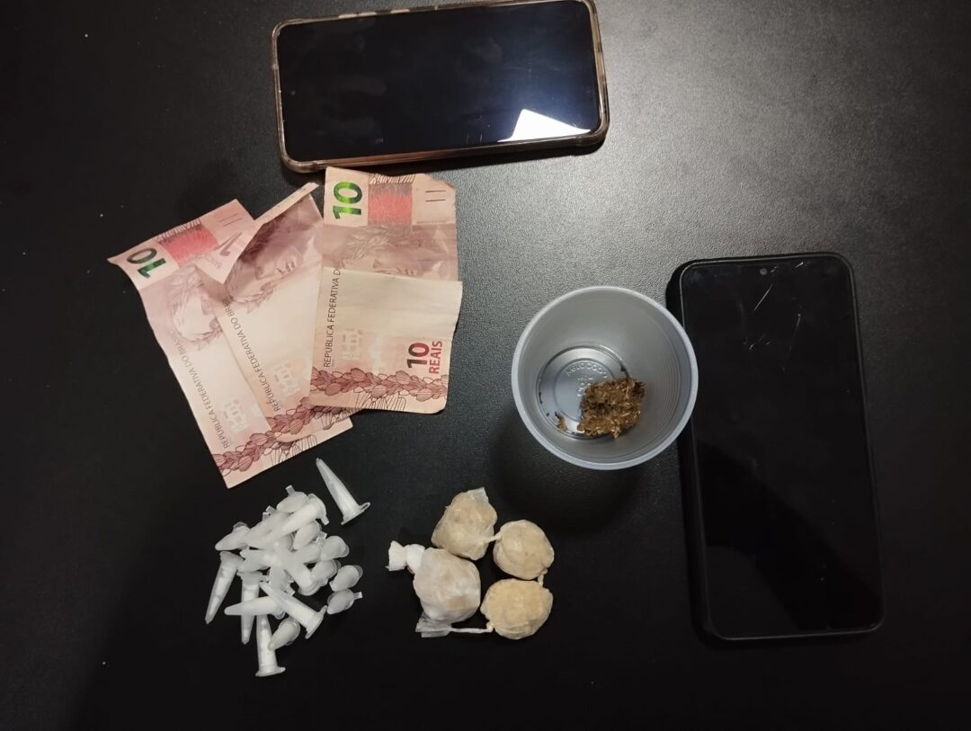 A operação contou com apoio da Polícia Militar. Ao chegarem ao endereço determinado, os policiais abordaram o casal no momento em que chegavam ao imóvel. Durante as buscas, foram localizadas quatro pedras brutas de crack (22,6 g), 23 pinos de cocaína (16,4 g), uma porção de maconha (18,9 g), além de R$ 30 em espécie, dois celulares e uma câmera de monitoramento.
