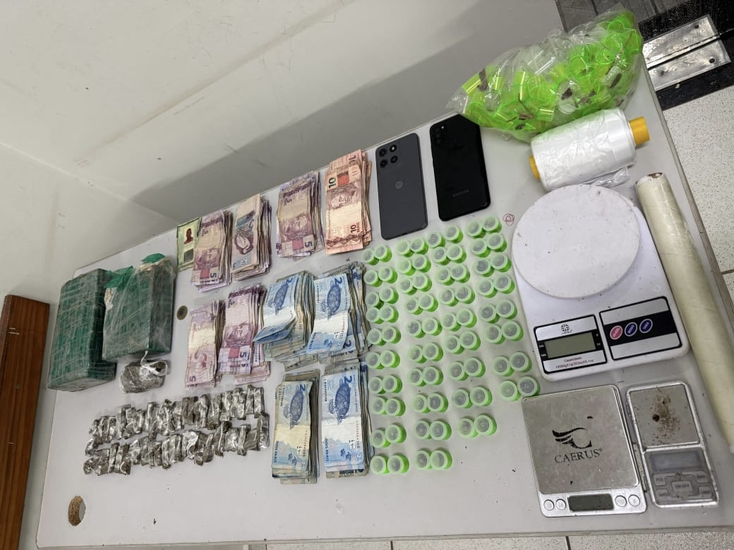 Durante a abordagem, o homem indicou outros locais onde havia mais material ilícito. Nas buscas, foram encontradas novas porções de entorpecentes, valores em dinheiro, balanças de precisão, aparelhos celulares e diversos objetos utilizados para o fracionamento e acondicionamento das drogas.
