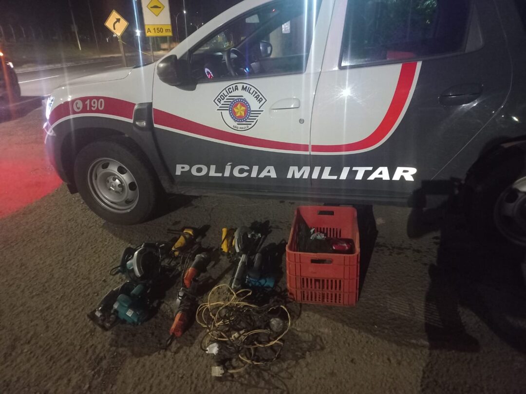 Durante a ronda, os policiais localizaram um homem com as mesmas características repassadas, carregando uma caixa plástica sobre os ombros. No interior da caixa foram encontradas diversas ferramentas elétricas e manuais, como serras circulares, esmerilhadeiras e extensões elétricas.