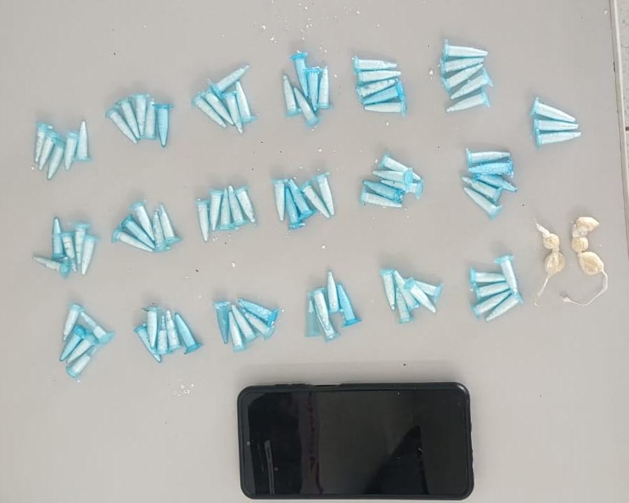 Foram apreendidos 91 microtubos contendo cocaína, cinco porções de crack e um aparelho celular Samsung.