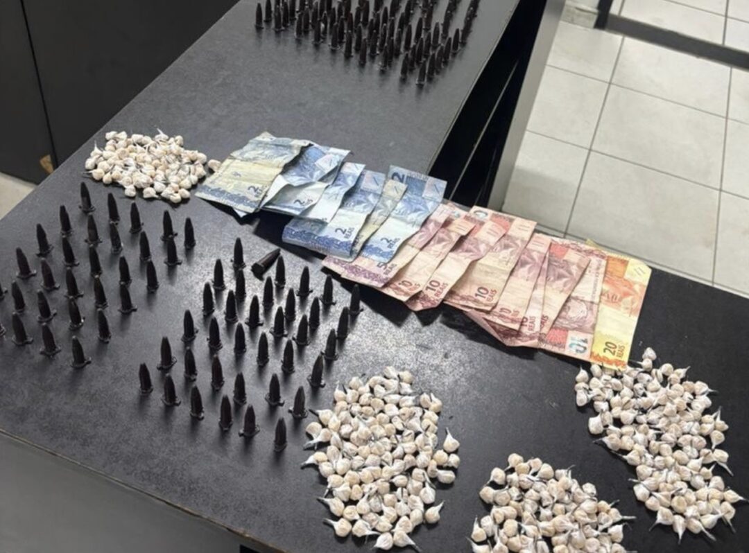 Na ação foram apreendidos 180 eppendorfs de cocaína (0,111 kg), 392 pedras de crack (0,098 kg) e R$ 109 em dinheiro.